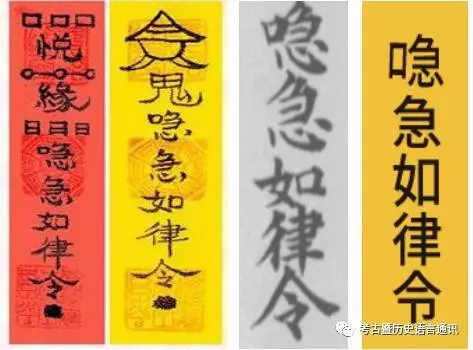 有時,在符咒用紙書寫面積狹小時,為了省字,也直接簡稱為「急如律令」。我們知道,在古代中國,符咒用字輕易是不能省略的。顯然,最初應該有個完整的書寫過程。下圖就是完整書寫到省略的兩組古代實物對比: