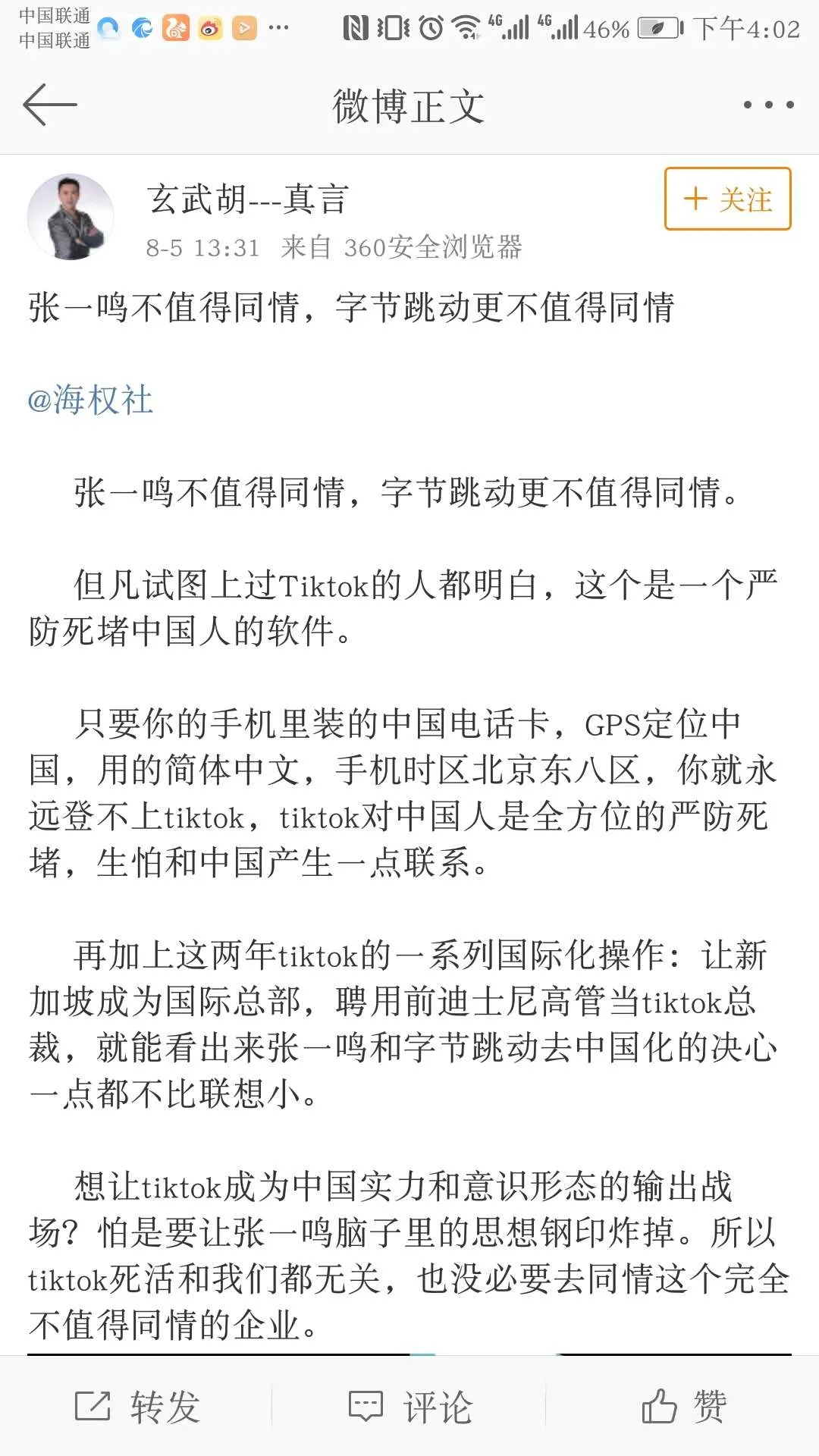 位元組跳動在這件事情上,現在處於兩邊不是人的境地。美國那邊,把TikTok在美國的成功視為對美國意識形態、國家安全的威脅,賦予了TikTok中國民族企業的屬性。而中國的網民對TikTok不太認賬,除了位元組跳動最近的表態被很多網民解讀為「跪」得太快,沒有氣節之外,對於TikTok是否有中國民族企業的屬性,TikTok到底是一家美國公司,還是一家中國公司,質疑很多。有人發現,TikTok是一款嚴防死堵中國人的軟體,「只要你的手機里裝的中國電話卡,GPS定位中國,用的簡體中文,手機時區北京東八區,你就永遠登不上TikTok,TikTok對中國人是全方位的嚴防死堵,生怕和中國產生一點聯繫」。