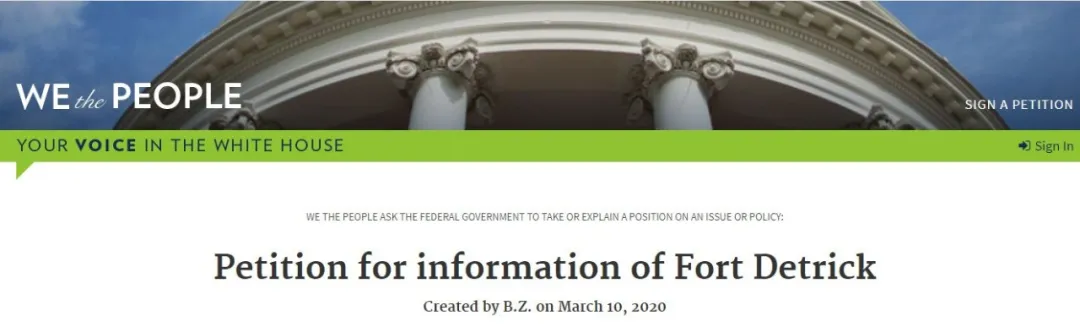 3月10日,名為B.Z.的網民在白宮請願網站「我們人民(WE the PEOPLE)」發起一條請願貼,要求美國政府公布去年7月關閉德特里克堡生物實驗室的真正原因,以澄清該實驗室是否是新冠病毒的研究單位,以及是否存在病毒泄漏問題。