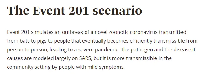 據「事件201」官網介紹,當時演習的場景是:模擬了一種新型人畜共患病冠狀病毒(CAPS)的暴發。該病毒比SARS更容易傳播,可能由癥狀較輕的個體傳播。這種病毒起初由蝙蝠傳播給豬,再傳播給人,最終變異為可在人與人之間傳播,從而導致一場傳染嚴重的流行病。