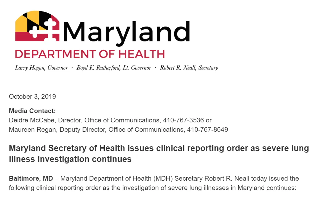 截至2019年10月3日,德特里克堡基地所在的馬里蘭州出現23例(僅包括自願報告的病例)電子煙疾病病例后,該州衛生部長羅伯特·尼爾對醫生髮布了新的命令。
