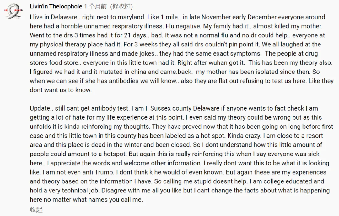 我住在特拉華州,就在馬里蘭州旁邊,相隔1英里的樣子。11月末12月初,我們這裡的每個人都得了一種可怕的不明呼吸道疾病,有流感癥狀。我的家人就有,並且我母親差點死於其中。去看了三次醫生,癥狀持續了21天。很糟糕,這不是普通的流感,醫生也無能為力。我那個治療中心每個人都有這種癥狀。整整三周,他們都說醫生們無法確定病因。我認為這種病毒先在我們這裡有,然後在中國發生了變異,又傳了回來。從那時起,我母親就在隔離了。因此我們看看她是否有抗體就知道了。而且他們拒絕在這裡給我們進行檢測,彷彿不想讓我們知道似的。
