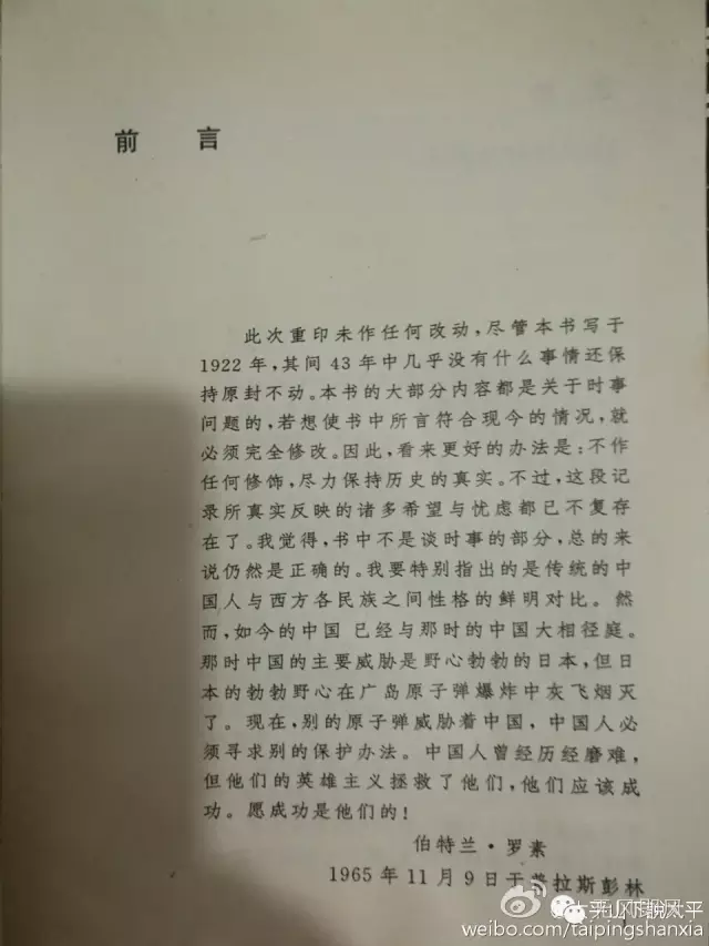當時的中國可謂完全處於內憂外患之中!1922年1月4日,參加華盛頓會議的中國代表與日本就膠濟鐵路問題進行會外談判。同日,上海召開大會,要求廢除"二十一條",解決山東問題,反對四國協定。2月4日,中國簽訂《解決山東懸案條約》及《附約》。6日,美、英、比、法、意、日、荷、葡和中國北洋政府在華盛頓會議上籤訂"九國公約"。2月28日,中國政府收回中東鐵路。5月4日,孫中山再次下令揮師北伐。5日,張作霖宣布滿蒙獨立。6月11日,黎元洪重任總統,召集舊國會。16日,陳炯明叛變,帶領部下圍攻總統府,轟擊孫中山住所。孫逃離廣州,於8月14日抵達上海。蔣介石隨行護衛,從此青雲直上。7月2日,北伐軍回師討伐陳炯明。8月2日九江兵變。9月19日黎元洪以王寵惠為內閣總理,開始組閣。10月23日毛澤東率領長沙泥木工人罷工請願。當時中國外有列強環伺,內有軍閥割據,北洋政府與孫中山南方政府分庭抗禮,戰爭頻仍,平頭百姓身不由己、苦不堪言,在如此令人窒息的大時代大環境之下,哪裡看得到一絲希望?一年前的1921年,倒是有十二個"進步人士"在辛苦躲過密探搜捕后在浙江嘉興南湖的一隻遊船上宣告成立中國共產黨,可那時誰也瞧不上這麼一個無權無勢無兵無槍的小政黨,畢竟前面有什麼國民黨同盟會興中會民盟等等較大政治團體相繼湧現過,誰也不相信也不會猜到這個一開始只是由十來個青年成立的新政黨日後會有任何作為!中國人猜不到,英國人羅素也想不到!他只是希望盡量能以自己的專業知識和智慧眼光去嘗試深入探討剖析中國的種種問題,甚至提出自己的解決辦法。作為一位十分關心人類進步事業的人文學者,羅素不僅深切同情和支持被壓迫民族,而且一直對中國人民懷有特殊的真誠而友好的情感。《中國問題》一書就是羅素在這種背景和情感的驅使下,經過到中國的實地考察,於1922年撰寫的講述中國問題的著作。但即便如此,往後的事態發展也是羅素萬萬所不能預見般的不可思議。因此當此書43年後於1965年再版時,當時新中國己建立了16年,羅素為此書寫了一篇前言,在前言中他寫道:中國人曾歷經磨難,但他們的英雄主義拯救了他們,他們應該成功。願成功是他們的!羅素的政治立場是反共的,確切來說應該是反蘇。但出於一個哲學家及人文學者的良知,他還是極力肯定了中國人及中共的成功並且送上誠摯的祝福,作為一個有著深度哲學思維及戰略眼光的智者,他看出了中共成功因素當中英雄主義及中國傳統智慧所起的作用並極大地給予肯定。是的,中國歷史上從來不缺英雄,正如我們的人民英雄紀念碑上所寫,不論觀點異同,每一個曾為這國家探索思考行動付出甚至犧牲的都是英雄,第一代的中國共產黨領導層正是集前人之努力而大成,而毛澤東先生,作為該黨的締造者、領導者、指揮者、決策者,毋庸置疑是中國歷史尤其是近代史上最重要的人物!筆者希望以個人的觀點及角度,去探討毛先生對中國所作出的巨大貢獻,至於認同與否,則請閱者自辨!
