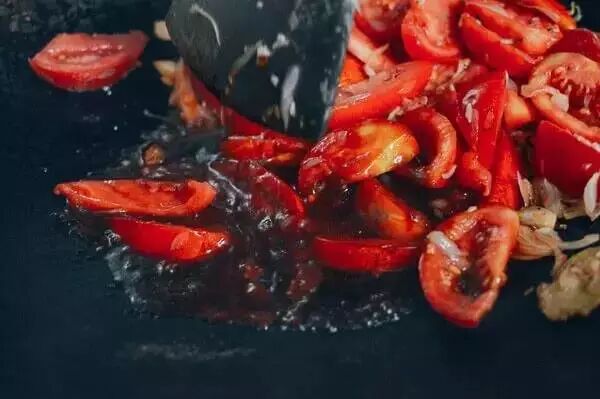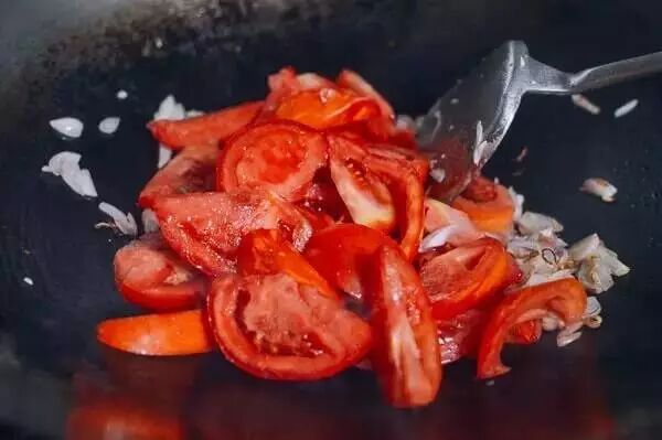 ▼倒入切好的番茄,將調好的醬汁倒入鍋中翻炒,混合。