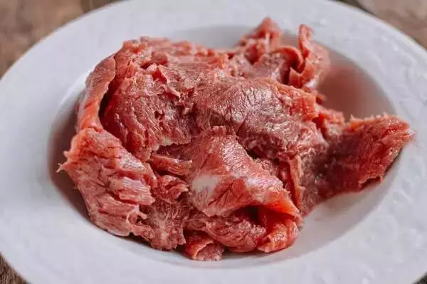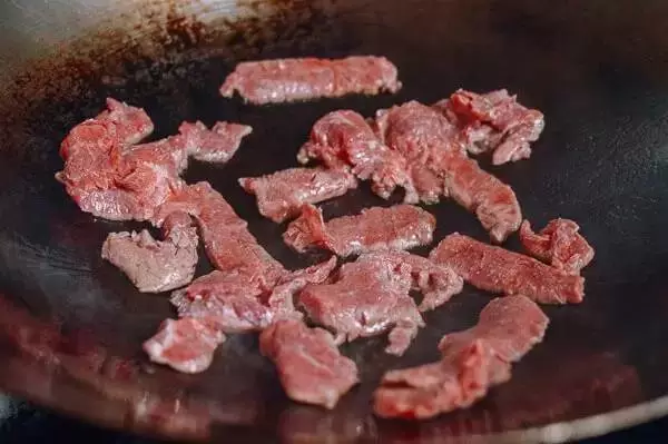 ▼大火熱鍋,倒入一勺油,待油熱后倒入牛肉,轉中火,炒1分鐘,至8成熟。盛出。