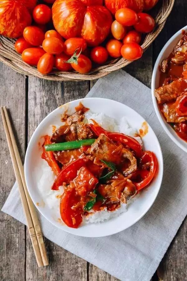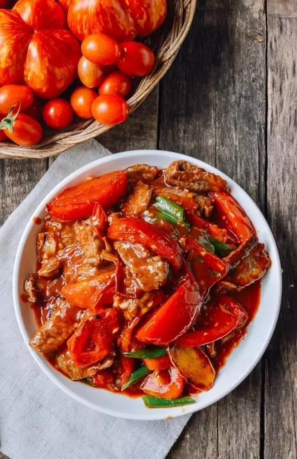 腌牛肉:牛肉400g,玉米粉,食用油1茶匙,鹽1/4茶匙。醬汁:番茄汁2勺,醬油2勺, 白砂糖2勺,芝麻油1/2茶匙,胡椒粉少許。其餘:大番茄4個,食用油3勺,生薑2片,大蒜1瓣,料酒1勺,玉米粉1/2勺,與1勺水混合。