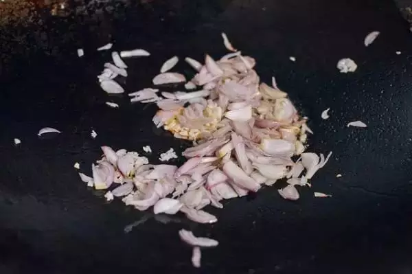 ▼中火熱鍋,再加一勺油,倒入薑片、蒜末、香蔥炒香,約10秒。