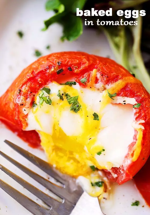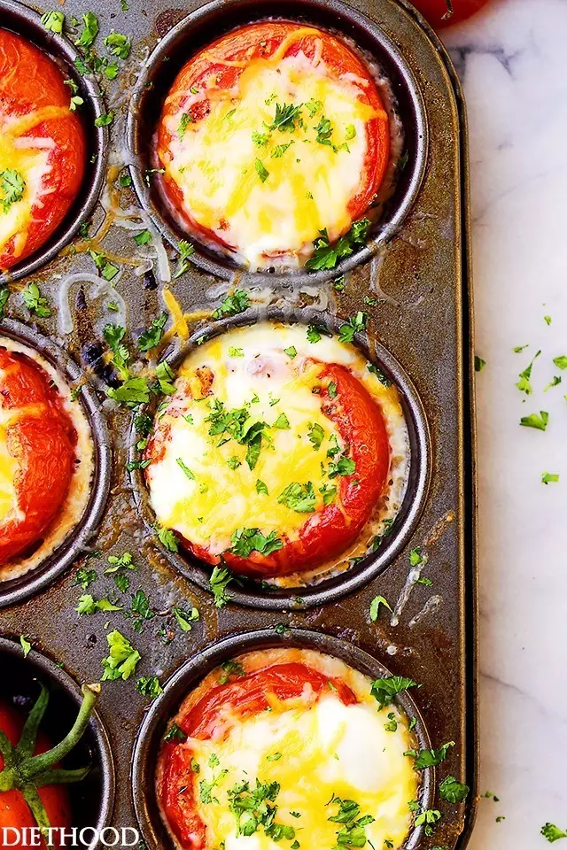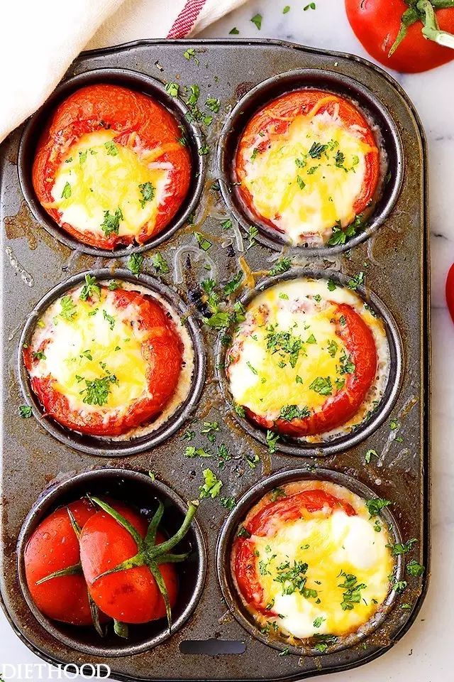 ▼將番茄放在麥芬烤盤中,中間滴一點油,撒上胡椒粉和鹽,烤15分鐘。取出,打入雞蛋,再烤12-15分鐘,至雞蛋定型。