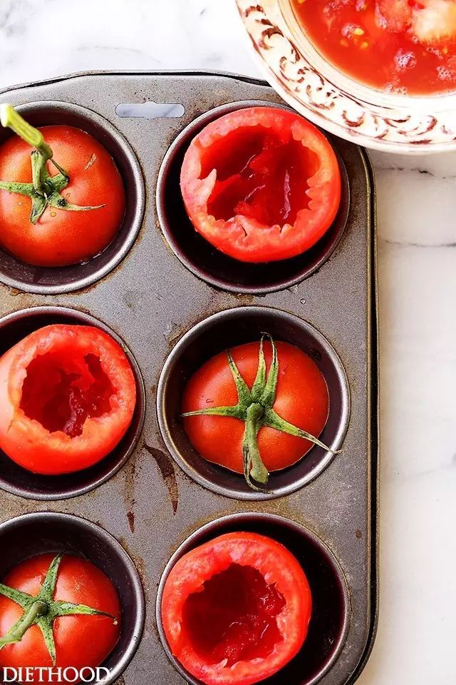 ▼烤箱預熱至180度,番茄洗凈,切開頂部,將中間挖出,可用來煮湯。