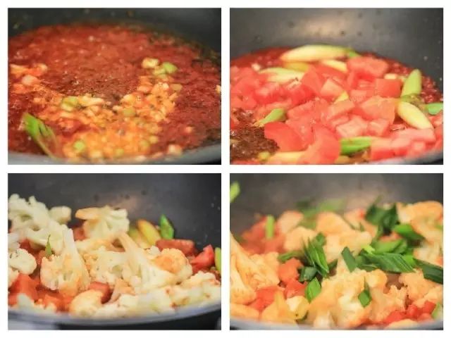 ▼鍋中加入1勺食用油,大蒜,大火炒香,再加入番茄汁,混合。倒入花菜和番茄,翻炒1分鐘,倒入蔥段,加鹽,混合在一起翻炒均勻。