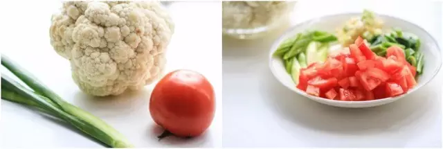 ▼將花菜切小塊,在沸水中煮2分鐘,盛出,瀝干水。將番茄切成小方塊,香蔥切段,大蒜切碎。