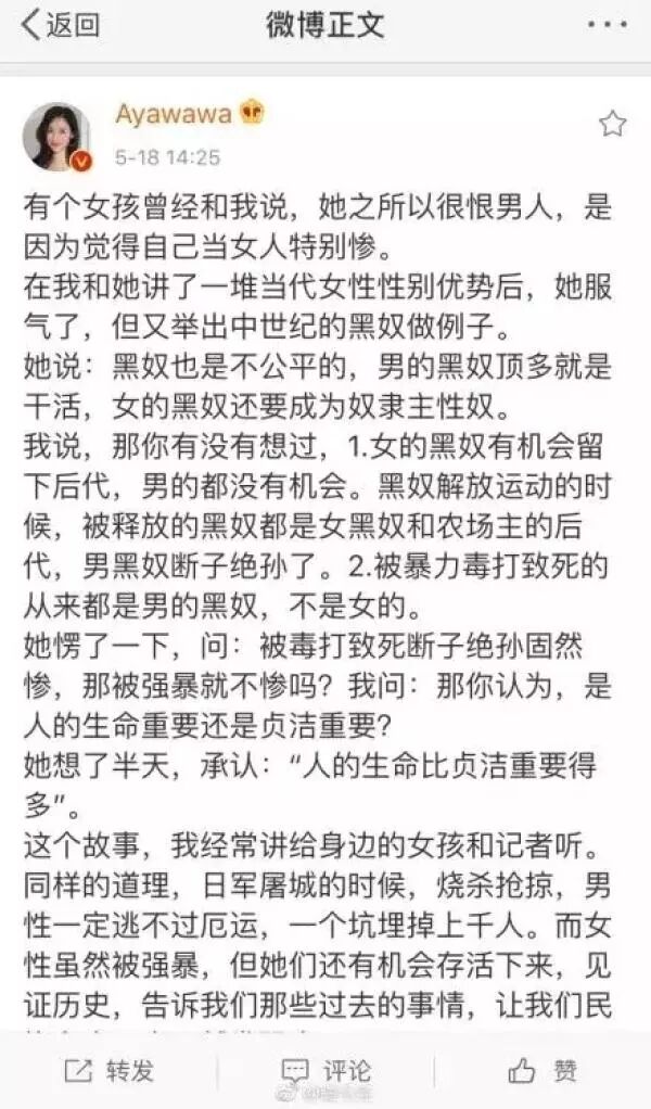 5月22日,據@微博管理員消息,據公眾號「穀雨實驗室」報道,新浪微博用戶@Ayawawa 在線下某活動中發表有關慰安婦的嚴重不當言論,引發了社會輿論的集中批評。