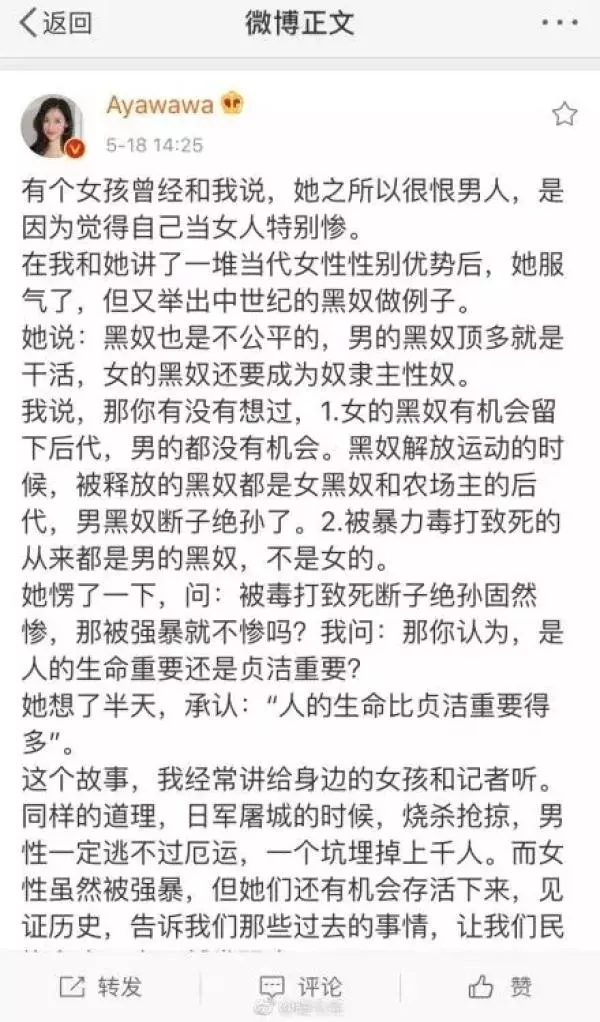 5月18日下午14時25分,@Ayawawa發布一條微博,其中提到「日軍屠城的時候,燒殺搶掠,男性一定逃不過厄運,一個坑埋掉上千人。而女性雖然被強暴,但她們還有機會存活下來,見證歷史,告訴我們那些過去的事情。」