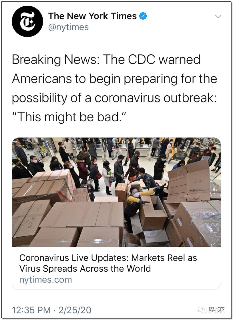 而我們文章中一開始看到的幾大疫區多少都和美國有關係,伊朗庫姆是教派聖城,經常有中東地區信徒朝拜,庫姆的朝拜團不少來自美軍事基地附近;義大利是美國熱門旅遊目的地....是否真正和美國有關我們不能下結論,我們只知道,美國CDC是真的慌了,看下紐約時報的報道: