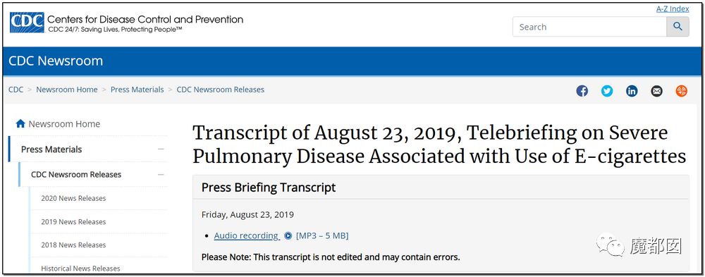 更加諷刺的是美國CDC也發文說了電子煙導致肺炎的事情。結論是……無法確診到底電子煙哪裡引起肺炎。
