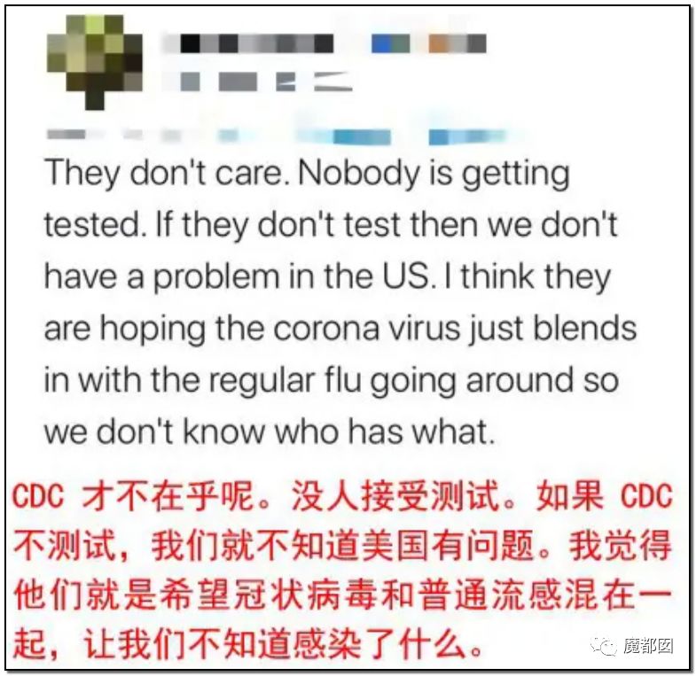其次她又尖銳的指出,美國之所以沒有做「大面積檢測」歸根結底還是一個字:錢!美國的檢測都要自己付費,很多老百姓沒這個費用或者不想付,就主動對醫生說是流感,醫生也不管,按照流感治,治好了就好,治不好翹辮子。