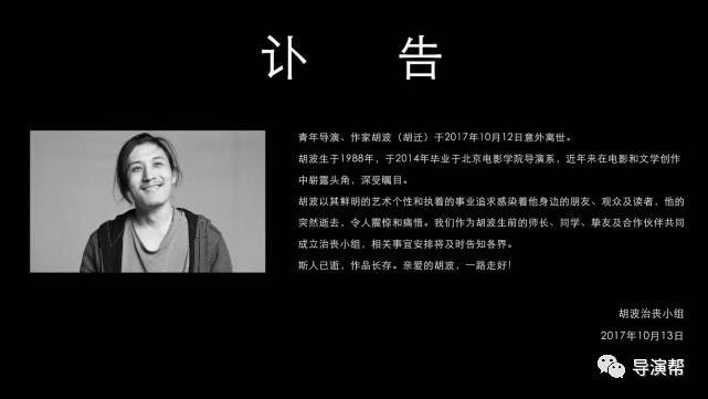 翻至胡遷最後一篇微博的文章底部,他寫道:「一個多月前看徐浩峰更新的博客,我盯著那句『一念之愚,千里之哀』愣了半小時。不是因為那會兒『千里之哀』了,是意識到這句話時,一切都已不可改變,早些年即便知道這個道理,也不會信,現在哀也沒毛用。三月份在劇組時就聽說了好幾個自殺的,當時還沒覺得什麼,等我自己的電影在半年後沒了才發現,都他媽完了。」