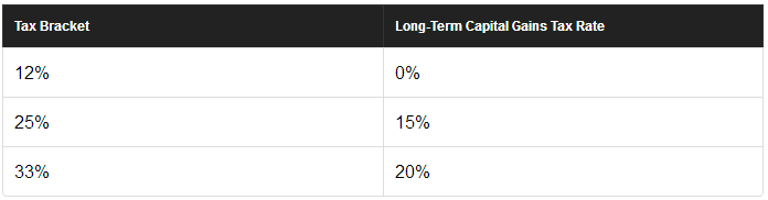 第三個關鍵詞是長期資產收益(Long-Term Capital Gain),長期資產收益是指在一年之後賣出的資本同時獲利的交易行為。通常會計師都會建議客戶持有資產超過一年以上在出售,因為長期資產收益稅可以更少的稅。如圖,長期資產收益在稅率等級10%和15%是免稅的,從稅率等級25%到35%之間是固定的15%,最高的等級也只徵收20%。因此長期資產收益是有很大的優勢的。