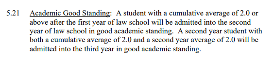 當學生的成績低於2.0的時候,將被留校查看(probation)。大三的學生,在第三學年年底的時候,GPA累計平均值如果還是小於2.0,將會繼續在夏季學期和秋季學期留校察看。如果之後成績仍然未能提高,將面臨被學校開除(dismiss)的處境。以Law School為例,第一個學年累積GPA需要在2.0以上才能進入第二個學年學習。第二學年GPA和累積GPA都要在2.0以上才能進入第三學年學習。