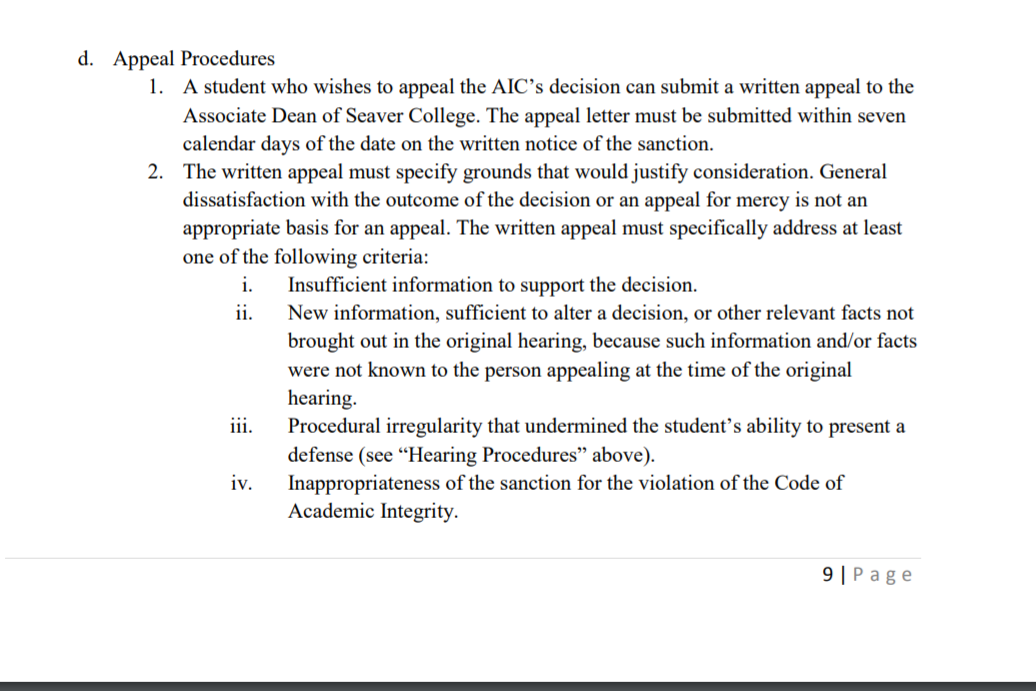 所有的學術不誠信行為都會被上報給學校的the Academic Integrity Committee (AIC)。在收到上報后,AIC會負責調查並給出初步的判罰結果。如果學生承認了學術不誠信行為,可以接受處分或者保留申訴處分的權利。如果學生對判罰有異議,AIC則會通過聽證會的形式對案件進行正式的審理。學生需要準備詳細的書面材料並在聽證會開始前24小時提交給AIC。