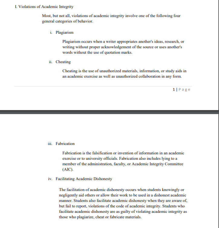 對於學術不誠信的行為的定義包括但不限於:Cheating, Fabrication, Plagiarism, and Facilitating Academic Dishonesty.
