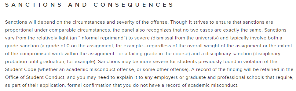 若授課老師將學生的學術不誠信行為上報至the Committee on Academic Misconduct (COAM),COAM將會通知學生,並解釋相關的指控和老師提供的證明。如果此時學生承認自己的行為,COAM會根據相應的學術誠信規定,給予一定的處罰。學生也可以要求舉行聽證會來做出判罰。