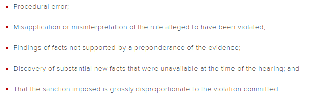 在聽證會結束后,學校會給出判罰。如果學生對判罰不滿意,可以提出申訴。申訴必須在收到決定的五天內,向校方提交正式的書面申訴信進行申訴。申訴由教務長做出最終決定。該決定不可再申訴。通常,申訴必須基於以下幾種理由: