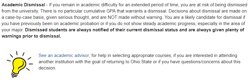 OSU對在校學生的成績有一定的最低要求。本科生需要保持累積GPA在2.0或以上,而研究生則需要保持累積GPA在3.0或以上。