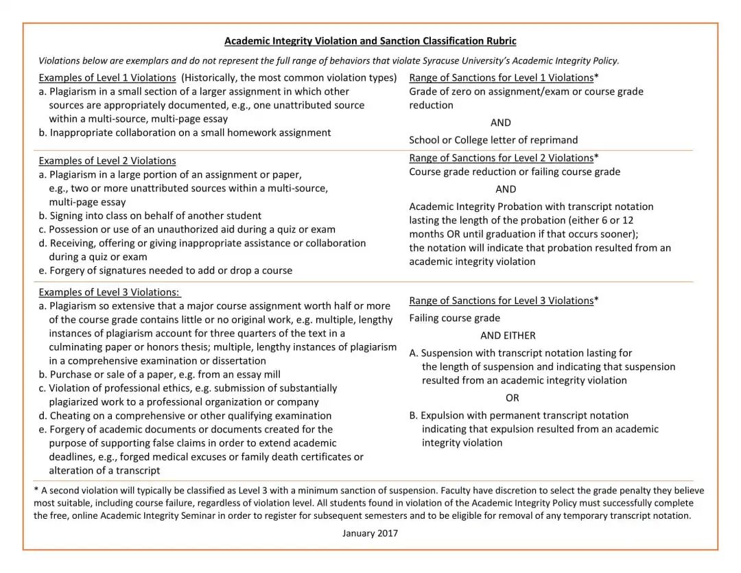 根據學生不誠信行為的嚴重程度和過往學生的學術誠信記錄,可能收到的處罰包括三個Level。具體的解釋可見下圖。對於初次違反的學生,除非情節特別嚴重達到Level 3的程度,處罰通常以成績處罰為主。而對於二次違反學術誠信的學生,則被視為Level 3,也因此面臨至少停學的處罰。