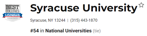 在2020年USNews美國大學排名中,雪城大學排名第54。