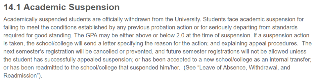 如果學生不幸被停學,如果想要回到雪城,除非申訴成功,或者轉入其他學院,否則需要在至少經過一學年後才能申請重新入學。上面的介紹,想必大家注意到了一個關鍵詞,就是:申訴!同學們一定要注意啦,如果成績過低而被停學,是可以申訴的。