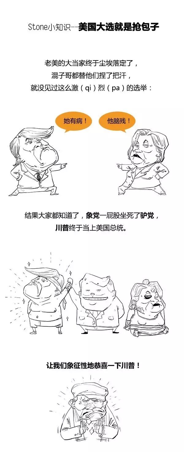 不過總桶競選時說的話是木有義務兌現的,也是基本兌現不了的,所以大家贏了的也別得瑟,輸了的也彆氣餒。港真,其實跟你我真的木有毛關係。過個四年八年的百分百大家會像煩黑八哥/民豬黨一樣煩床鋪/共和黨! 為啥聶? 因為政府和總桶都是為特定人群服務的,作為普通百姓的你我他總是有太多的不容易和不如意,感覺換個總桶會好過一些,用一個字來形容就是: 水中撈月!