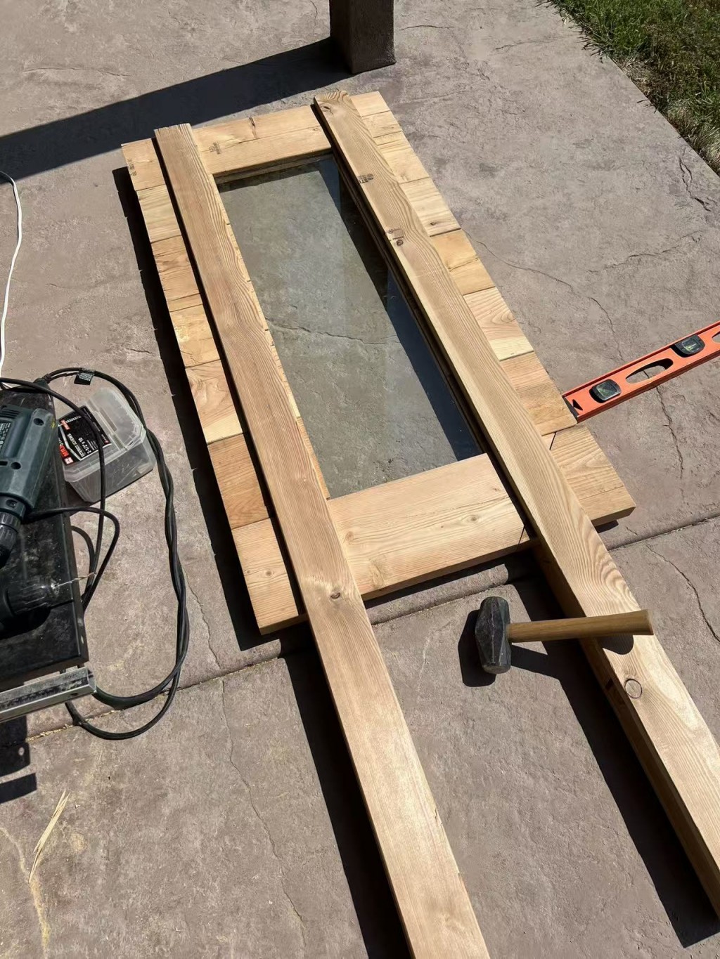 這個長周末幹了不少活。玻璃裝上了。本來打算裝在門上的。結果這塊鋼化玻璃有點重,裝在門上怕出問題,趕緊改個窗吧。這樣門就容易做了。邊角料利用基本最大化,成本可能會有所降低。因為工具有限,只有台鋸和手提轉鋸,所以做工的精細程度打了點折扣。不過大毛病木有。結構搭起來很快,細節感覺很費時。因為怕出錯,需要量兩次才敢下鋸。