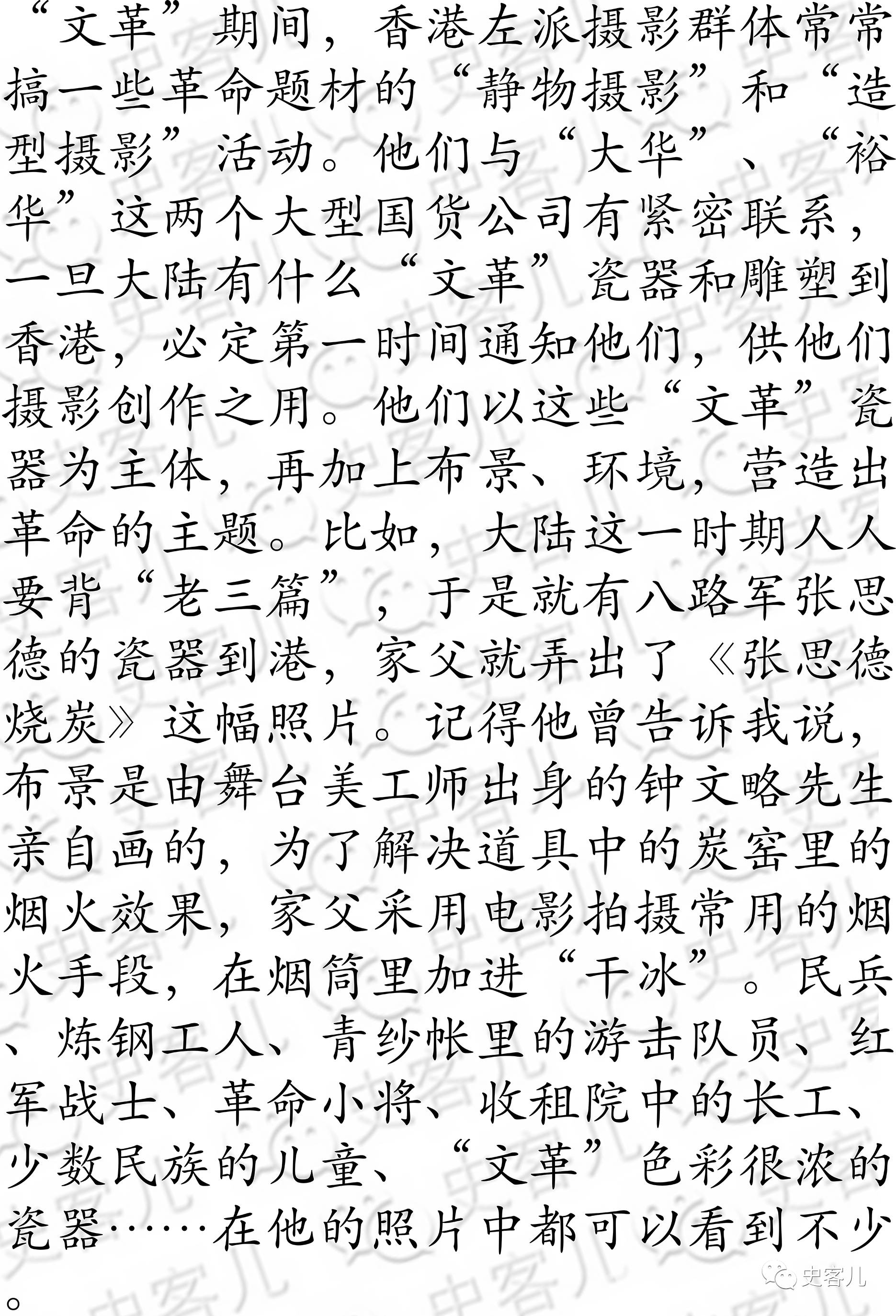 家父在香港一向被歸為左派攝影師。上世紀50年代,當時香港的經濟水平還與國內相差無幾,那時他就與香港「紀實攝影」領頭人陳跡先生(前不久去世)一起用手中的「祿萊」120相機記錄著香港的中下階層的生活形態。這一時期,這個群體有麥烽、鍾文略、陸幸如(女)等先生,後來從東南亞回港的陳復禮先生也加入其間。香港的各大事件,特別是勞工、社團生態、藝人生活等在他們的鏡頭裡都有充分的反映。當時他們的口號是「愛祖國,用國貨」,「用攝影去反映下階層」,「無情揭露港英政府」等。至60年代中後期香港經濟騰飛,香港社會形態和思潮發生了很大變化,這一左派攝影群體也隨之分化,雖然以陳跡為首的幾位仍然在街頭巷尾「捕風捉影」,而這時候香港攝影界已無什麼「左派群體」可言了。