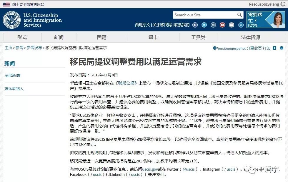 移民局官方網站發布的消息 川普政府近日在《聯邦公報》上公布,計劃大幅調升移民申請費用漲幅逾60%。對於部分案件而言,漲幅將達83%。入籍申請費從現在的$725漲到$1170,針對某些特殊移民的費用可能更高。庇護申請收取$50的申請費,申請工作許可則花費$490。夢想生未來申請延續身份將需要支付$765,而非$495。U簽證申請,對一些人也將從$585增加到$1,415。