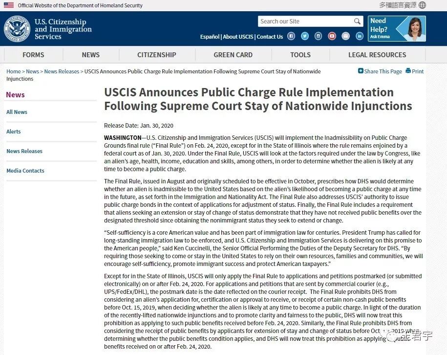 移民局(USCIS)昨天宣布將於2020年2月24日開始全美實施政府福利的最終規則,除在伊利諾伊州外。移民局將研究國會法律所要求的因素,例如申請人的年齡,健康狀況,家庭數量,收入,教育程度,技能以及雇傭狀態等,以確定該身份是否有可能在任何時候成為一項公共收費。