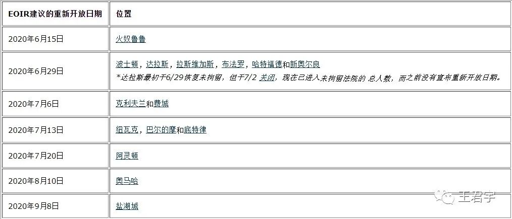 移民審查執行辦公室(EOIR)更新了各移民法院的運營狀態。關押案件(包括在關押的無人陪伴的孩子)的開庭計劃在將此時進行。對於非關押的案件,除非下文另有說明,所有移民法庭的開庭時間都將推遲至2020年9月4日(包括當日)進行。具體請參考下表: