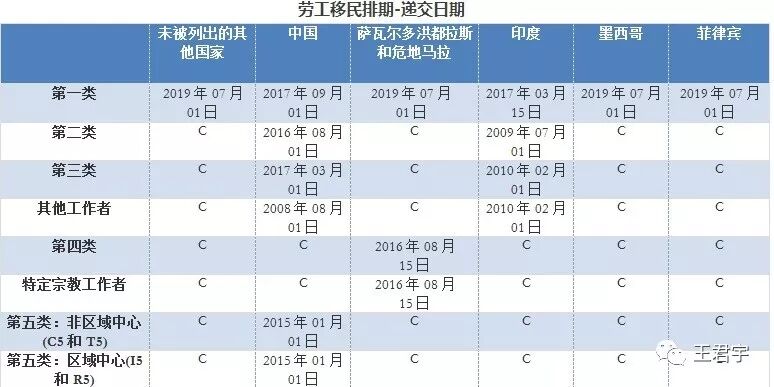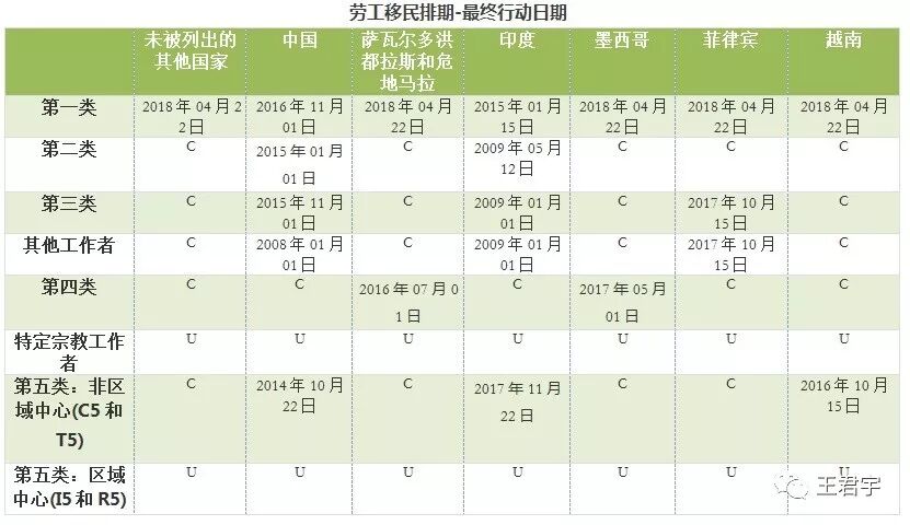 另外,最終行動日期代表(Application Final Action Dates):指有簽證名額的排期。遞件排期(Dates for Filing):指可以遞交簽證申請的排期。在下列表格中,每一類所列出的日期都已經是超額申請的,C 意味著現在,比如對所有有資格的申請人,授權發放的數量。U意味著沒有授權,比如還未授權發布的數量。