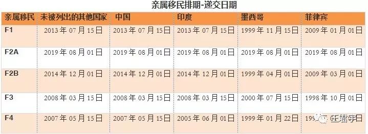 F1類別為美國公民未婚子女以及美國綠卡的配偶和子女,以及綠卡的未婚子女 F2A類別為美國綠卡的配偶和子女 F2B類別為美國綠卡的21歲以上未婚子女 F3類別為美國公民的已婚子女 F4類別為美國公民的兄弟姐妹