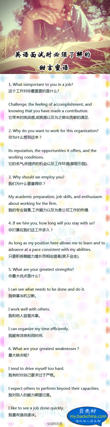 我不知道國內工作面試時所問的問題是不是如此輕巧就可以對付過去,但是在美國,這種千篇一律的空話,越來越難矇混過關了。現在面試往往強調的是問開放性的問題,逼迫求職者必須作出非常具體的回答。比如,看似無意地讓求職者說說履歷上所寫的某個以前的工作崗位的情況,然後根據他的敘述,從中挑非常具體的東西來問,以考察求職者的實際水平。比如你說你是個team player,以前曾經常與公司的銷售人員打交道,那就可能問你:與銷售員打交道,你覺得最難的是什麼?你在這方面遇到過的最棘手的問題是什麼?你是如何處理的? 這類做法千方百計讓你說實話,而且考驗你的反應和語言表達能力,因為你基本無法準備。 所以說,這種走捷徑的學英語法不可取。 |