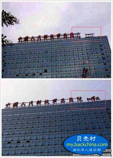 2014-08-02 訊 北京301醫院樓頂上的題字原來有「江澤民」三字的位置只剩下支架。而「中國人民解放軍總醫院」的「院」正被吊下來。 近日,有人將北京301醫院樓頂上的題字「中國人民解 ...