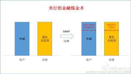 一圖看懂央行的金融鍊金術。央行當初每收一美元外儲,都要「印」相應的人民幣。央行的資產負債表上左側是外儲,右側對應的是發行的人民幣。現在央行通過SWAP和遠期交易,借給商業銀 ...
