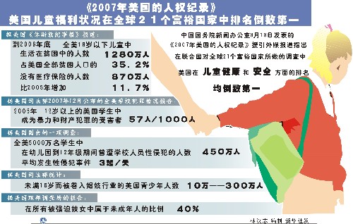 美國兒童狀況不佳。據《休斯敦紀事報》報道,聯合國對全球21個富裕國家做的調查顯示,美國富裕程度領先,但兒童福利狀況卻排名最後。在兒童健康和安全方面,美國均排名倒數第一。據統計,到2006年底,全美共有1280萬18歲以下的兒童生活在貧困中,佔17.4%,兒童佔美國全部貧困人口的35.2%,女性單親家庭的兒童生活貧困的比率更高達42.1%。(見注116)越來越多的兒童沒有醫療保險。據統計,到2006年底,全美18歲以下兒童沒有醫療保險的人數上升到870萬人,比2005年增加11.7%,兒童沒有保險的比率達19.3%。(見注117)兒童無家可歸者人數增多。據美國市長會議2007年12月發布的2007年美國23個城市的飢餓和無家可歸情況調查,在2007年,有孩子的家庭成員佔了使用緊急住所人口的23%,10個城市報告有孩子的家庭要求緊急住所救助的增加了。(見注118)據美國聯邦疾病控制與預防中心說,2004年美國的嬰兒死亡率達千分之七,而其中黑人嬰兒死亡率又是白人嬰兒的2.5倍。美國嬰兒存活率排名遠落後於其他發達國家。(見注119)據報道,一個得到72%的民眾支持、旨在幫助貧困兒童的「兒童健康保險擴充法案」在2007年被總統否決。(見注120)