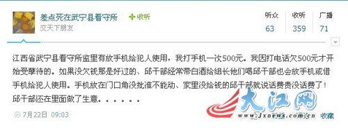 22日,網友「差點死在武寧縣看守所」在微博稱,武寧縣看守所監里放手機給犯人使用,打一次手機收500元。因打電話欠了500元,他始受虐待。該網友還稱,一名姓邱的幹部甚至在監獄里做起了生意。