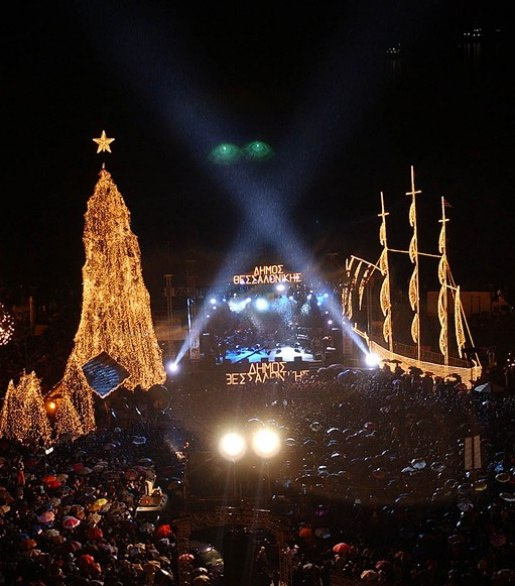 這棵20米高的聖誕樹不是塞薩洛尼基亞里斯多德廣場最主要的景點。一艘巨大、裝飾一新的船讓我們想起了希臘傳統里悉心裝扮的船而不是青蔥的樹木。
