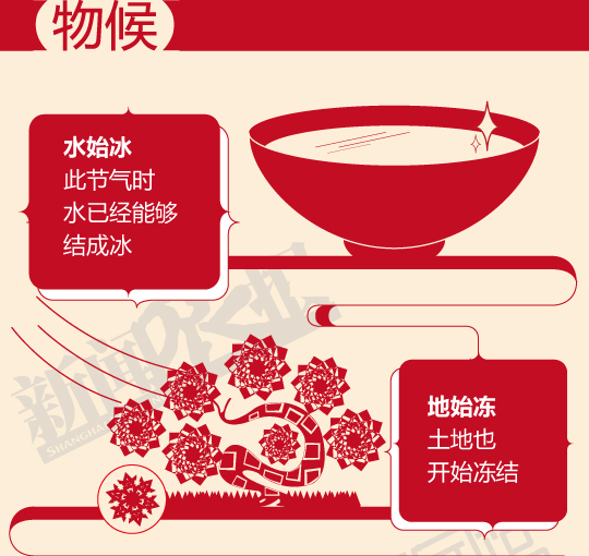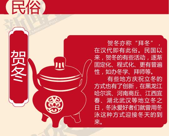 立冬不僅是收穫祭祀與豐年宴會隆重舉行的時間,也是寒風乍起的季節。有「十月朔」、「秦歲首」、「寒衣節」、「豐收節」等習俗活動。此時,在北方,正是「水結冰,地始凍」的孟冬之月,在南方卻是小陽春的天氣。