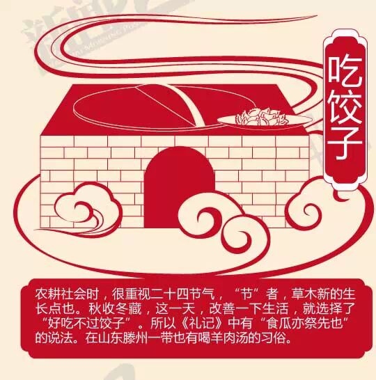 2、民間賀冬:民間有祭祖、飲宴、卜歲等習俗,大家也會更換新衣慶賀往來。