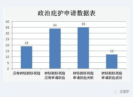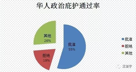 移民行政審查辦公室(簡稱,EOIR)還發布了另一個有關於華人的政治庇護的通過率。在總數為6,279 的華人的政治庇護申請中,只有3,438個申請被批准,也就是通過率為百分之五十五。這些申請中有1,193個申請被拒絕,也就是拒絕率為百分之十九。其他申請為1,648個,佔了百分之二十六。