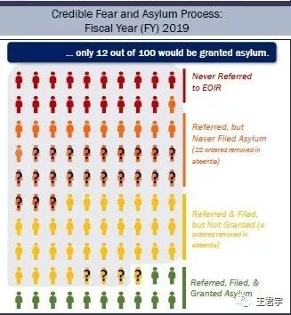 首先,政府會對所有的政治庇護申請人進行可信度問話(credible fear interview)。在一百個申請中,只有七十八個申請人被轉到移民行政審查辦公室(EOIR)。在這七十八個申請中,有六個案子會被關閉;有三個申請人在見移民法官之前就直接被送走;另外,有十三個申請人被要求去見法官,其中三個會被再次問話。在這一百個申請者中,有八十一個需要上庭。其中,只有四十七個政治庇護申請人最終被確認政治庇護申請。也就是說,只有百分之四十七的申請者才能被認為是政治庇護申請。在這四十七個政治庇護申請人中,只有十二個申請者的申請才會被通過,剩下的申請者將會被否決。也就是說,最終只有百分之十二的申請者的政治庇護申請才會被通過。
