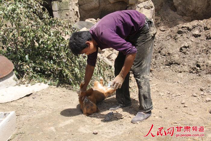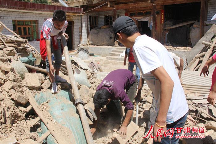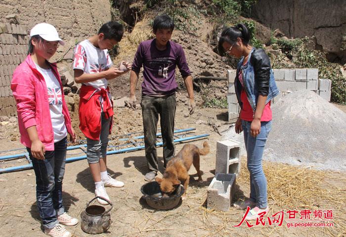 「哎呀,不會吧,你們快來聽,下面有狗叫聲,快把它救出來」。張鵬很快喊來張蛇生,兩人開始用手刨傳出聲音的地方……就在這時,8位從岷縣縣城趕來抗震救災的年輕志願者剛好從家門口走過,他們也加入到了救狗行列。「你小心,別把廢磚塊踩下去傷到狗」,其中一個叫包強的志願者提醒。沒多久廢墟就被刨了個坑,小黃的叫聲也更清晰了,慢慢地它的鼻子露了出來,可是一根木樁橫在了狗的頭上方,怎麼也把它拽不出來。「趕緊將木樁撬起來,清理掉旁邊的石棉瓦和廢磚塊」。張蛇生焦急地說。23日14點28分小黃出來了,張鵬很快給小黃接來一盆水,它喝完水,跳著、搖著尾巴在我們身邊竄來竄去……圖為小黃狗露出了鼻子。